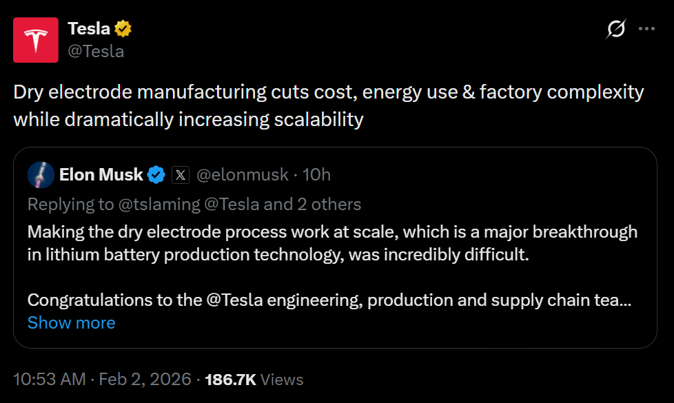 近日,埃隆·马斯克在社交平台上正式宣布,特斯拉已实现干法电极工艺的规模化量产,并称其为锂电池生产技术的一项重大突破。干法电极技术正式迈入工业化量产阶段,将对未来锂电池生成的成本、效率及固态电池发展产生深远影响,重构锂电池制造体系。