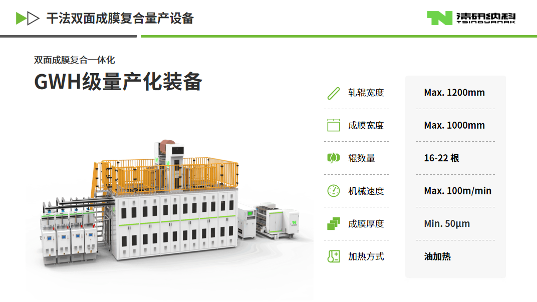 清研纳科推出的多辊双面成膜复合一体化设备,在性能上达到行业领先水平。设备幅宽最高可达1200mm,有效成膜宽度1000mm,负极成膜速度可达到80m/min,正极成膜速度突破60m/min,成功实现了干法负极的量产。